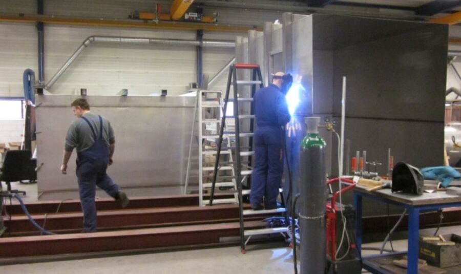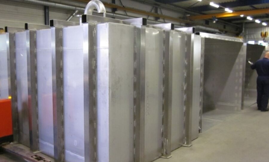 Deze tank heeft een afmeting van 9 meter lang, een hoogte van 2 meter en een breedte van 2.5 meter. Daarmee heeft deze tank een inhoud van 45.000 liter. Op verzoek van de klant zijn er meerdere aansluitingen, een mangat en vele verstevigingsribben er op aangebracht. Boven deze tank is de oude voorraadtank geplaatst. Daarvoor heeft Veratio een stalen constructie geconstrueerd en gefabriceerd. Dit gehele project is met speciaal vervoer naar de klant gebracht, en daar door Veratio geplaatst en aangesloten.
