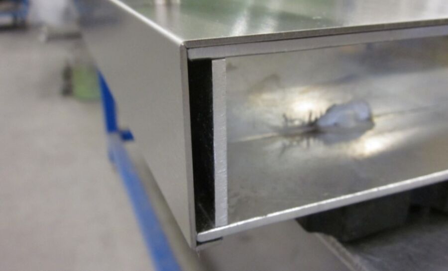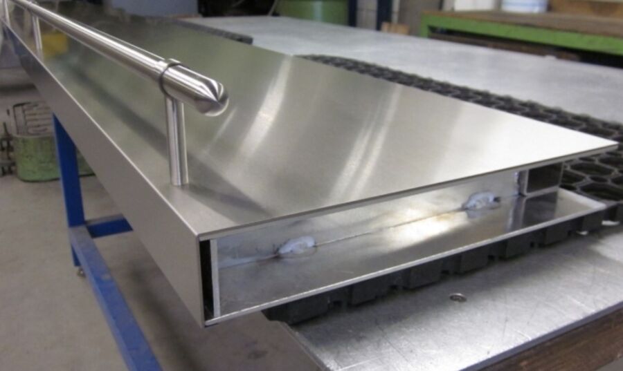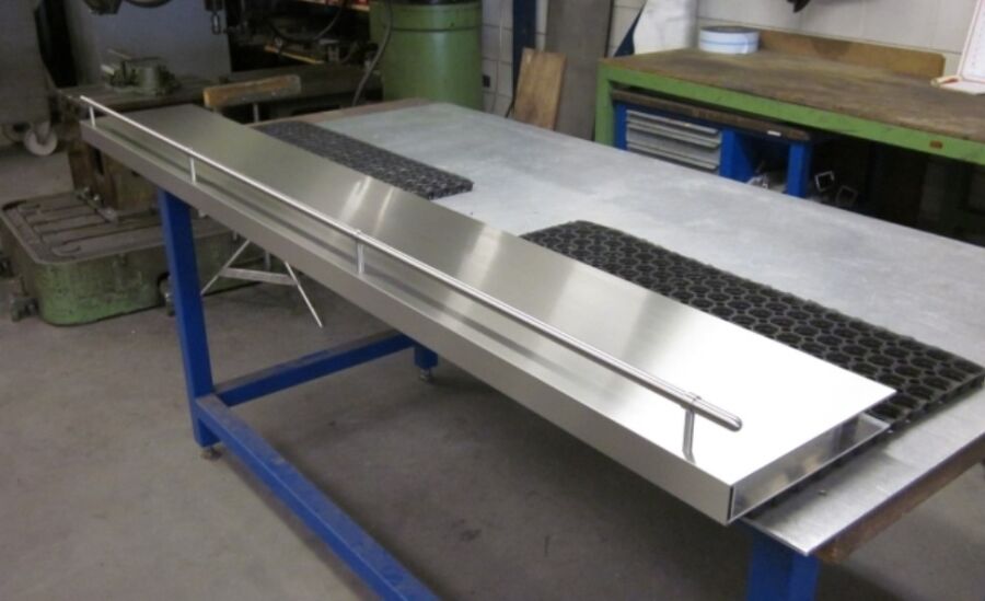 De plank heeft een aluminium binnenwerk waardoor deze met een blinde bevestiging gemonteerd kan worden aan de wand. De gezette plaat is voorzien van V-groove. Hierdoor ontstaat er een strakke buitenhoek. Op de plank staat een railing. Ook deze is blind bevestigd waardoor er geen schroefkopjes te zien zijn.